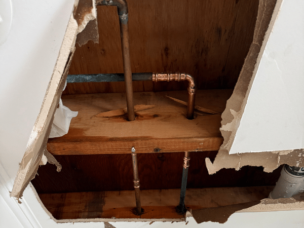The technician opened the minimum required section of drywall to expose the damaged pipe while limiting structural impact. - Removal of the failed pipe segment